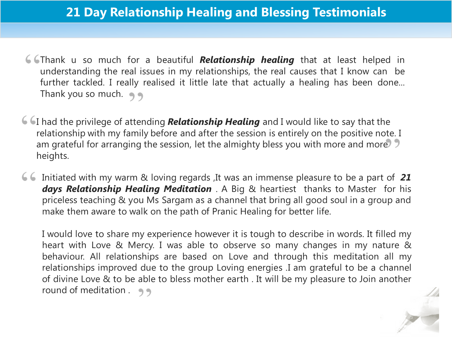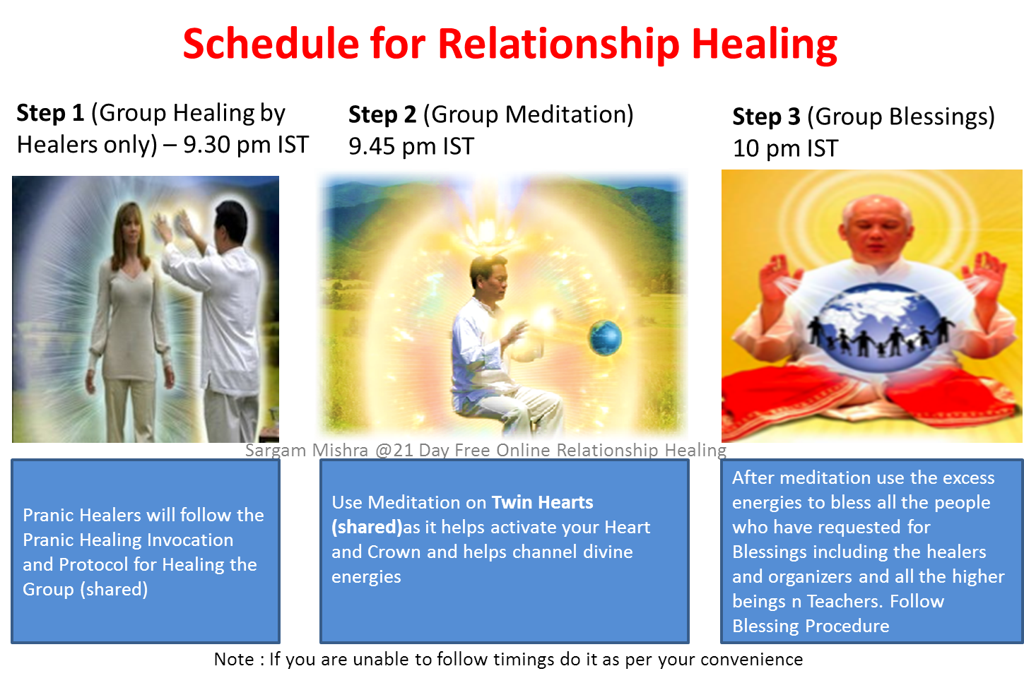 In this free online event we will do a collective blessing for all the people who are facing issues in their relationships this includes your life partner, work partner, parents, siblings or even your own self. Please send me your names and the person you want to improve your relationship with so that we can maintain a list and use it to Bless. (you can PM to maintain confidentiality) We will be doing a collective healing using advance Pranic Healing Techniques to heal the relationships .Any body who wants to volunteer to do the healing is invited as well we will tune in at 10 pm IST remotely from 1st April for 21 Days at the same time to leverage collective energies for the blessings and healing.