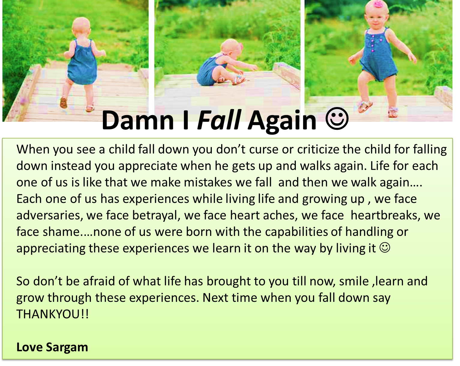 2.Instead of Looking at your whole life focus on the next right move – Most of us when fail in life we start fearing the uncertainities of life. We want to know what will happen to me 2yrs post a divorce, will I get the right partner, will I be having financial security etc etc. This thought process takes up the strength to move ahead in life.