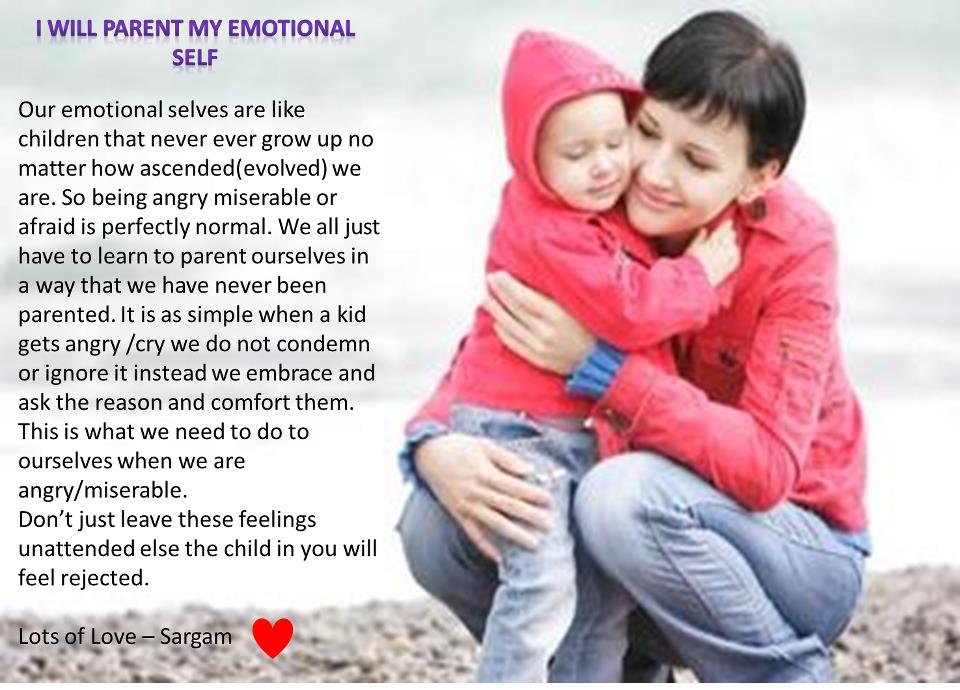 Our emotional selves are like children that never ever grow up no matter how ascended(evolved) we are. We all just have to learn to parent ourselves in a way that we have never been parented. It is as simple like this..when a kid gets angry we do not condemn him instead we embrace them this is what we need to do to ourselves when we are angry/miserable.